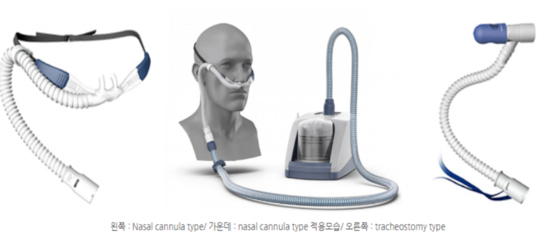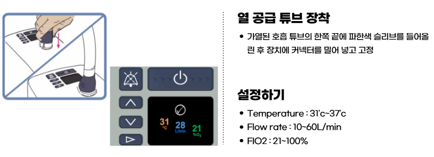 - 자발 호흡이 있는 환자에게 큰 직경의 캐뉼라를 이용하여 flow(2~60L/min)까지 최적으로 가온 가습 된 산소를 제공하는 것